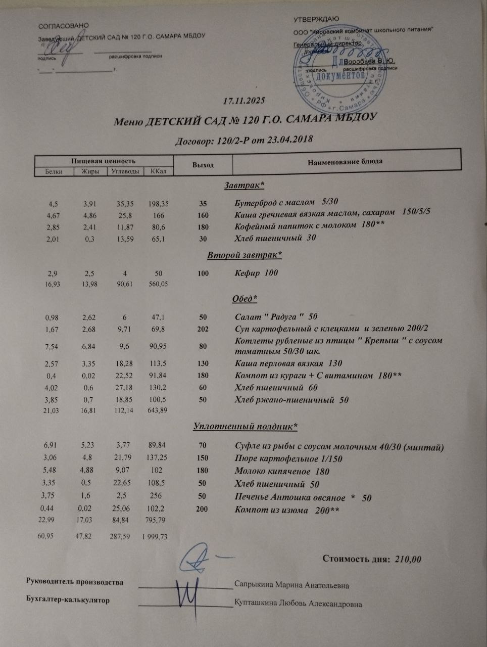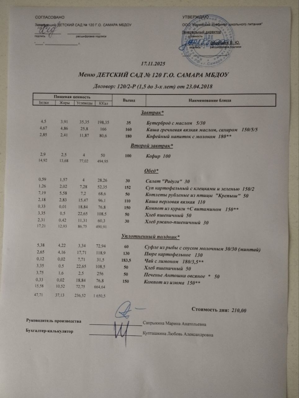 Актуальное утверждённое меню (примерное по сезонам в соответствии с возрастной категорией обучающихся, в том числе специализированное для обучающихся, требующих индивидуального подхода в организации питания)