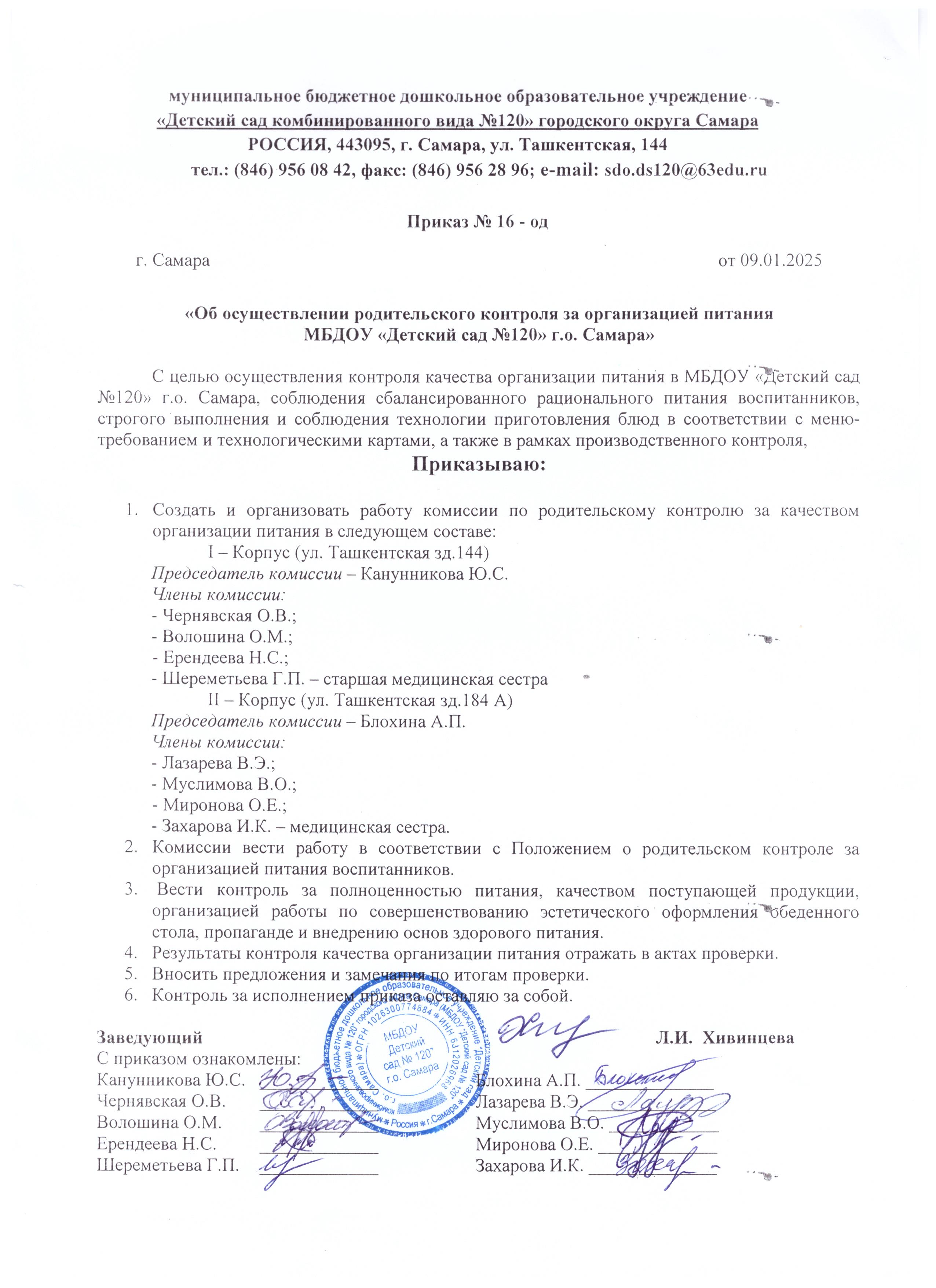 Приказ "Об осуществлении родительского контроля за организацией питания МБДОУ "Детский сад № 120" г.о. Самара"